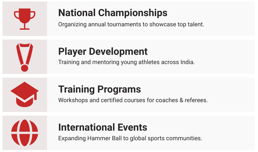 The World Hammer Ball (WHB) is the global governing body for Hammer Ball, and the Hammer Ball Association of India (HBAI) operates under WHB as its national affiliate. We are committed to developing and nurturing Hammer Ball as a recognized sport nationwide. We aim to build a strong sporting culture by organizing district, state, national, and international tournaments, providing training programs, and ensuring fair opportunities for all players.